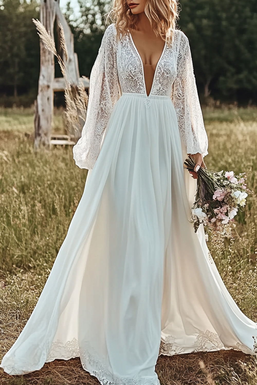 Boho A Line V Neck Illusion Sleeve Ivory Wedding Dress