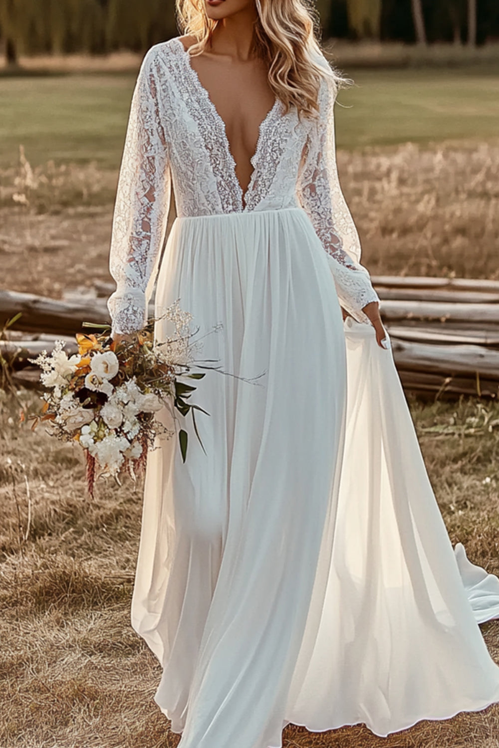 Boho A Line V Neck Illusion Sleeve Ivory Wedding Dress