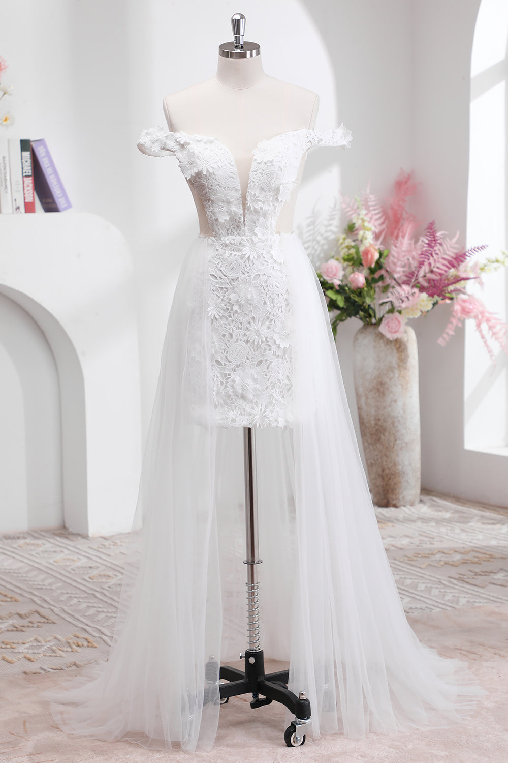 White A Line Off The Shoulder Wedding Dress with Appliques Lace