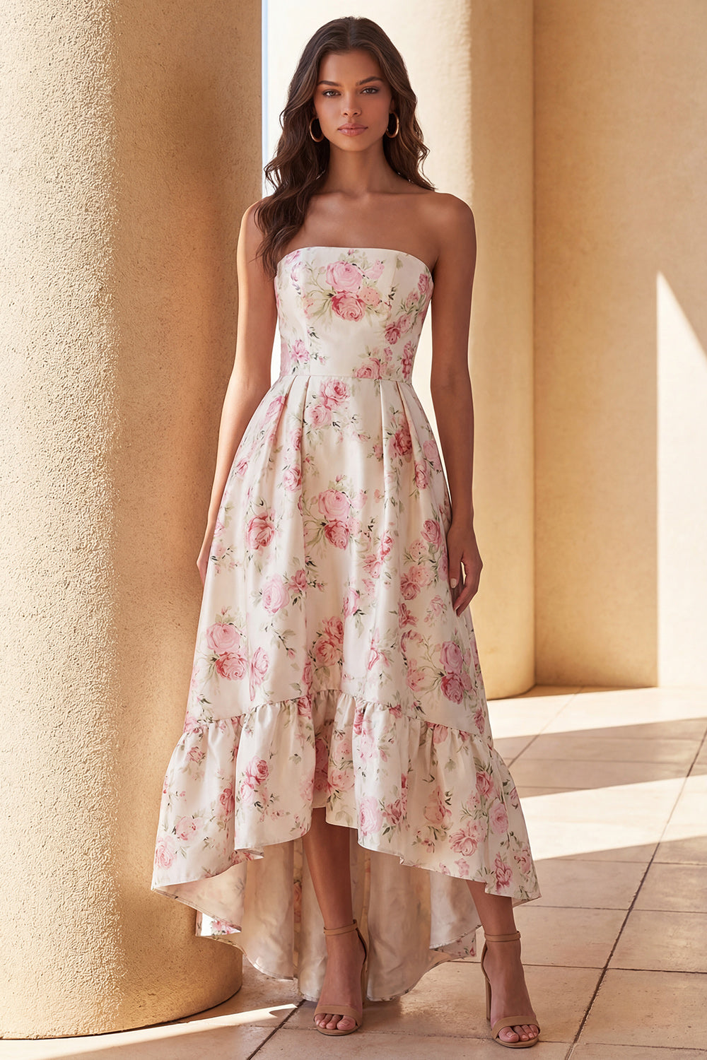 Strapless Floral White High Low Ruffled Wedding Guest Dress