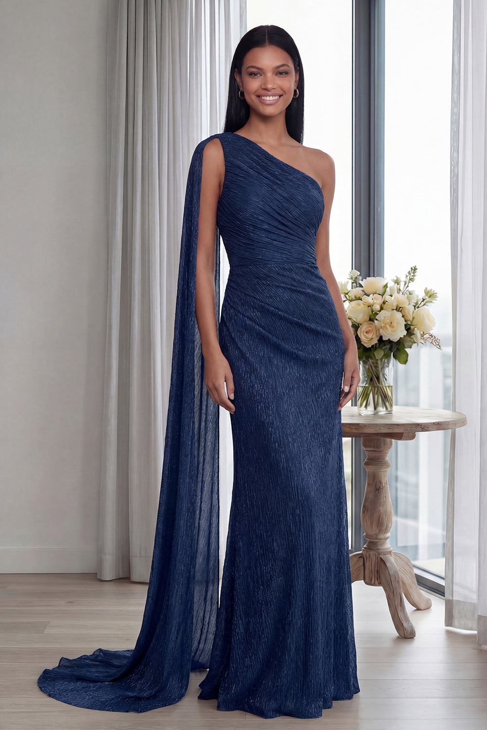 Navy One Shoulder Mermaid Maxi Formal Dress