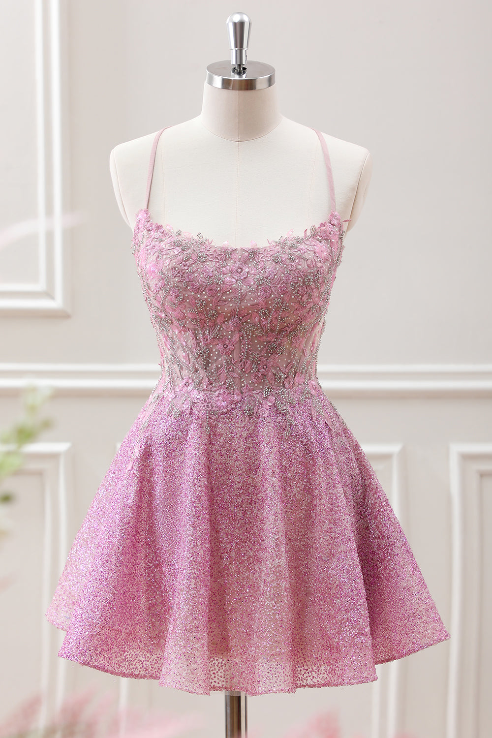 Cute A Line Light Pink Beaded Corset Floral Appliques Mini Dress