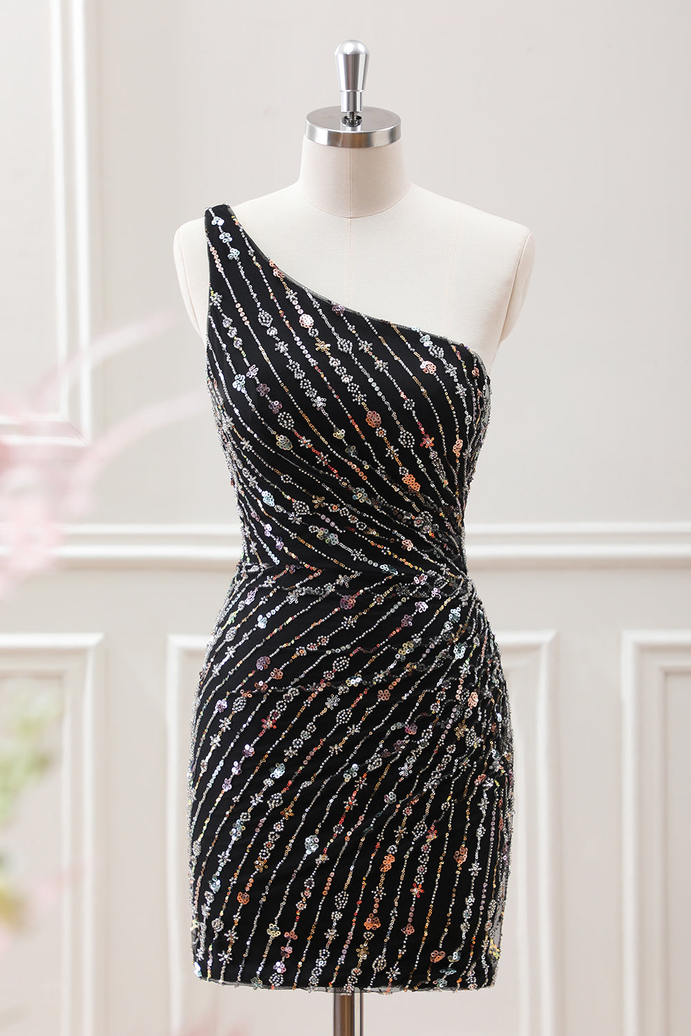 Sparkly Black Bodycon One Shoulder Lace Up Back Mini Dress with Sequins