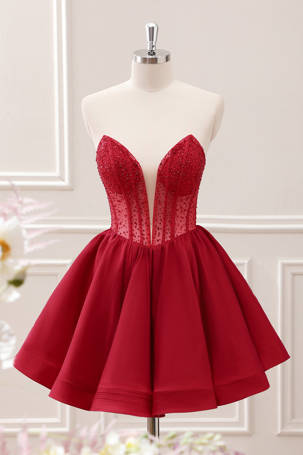 Red Strapless Beaded Corset Bodycon Homecoming Dress with Slit