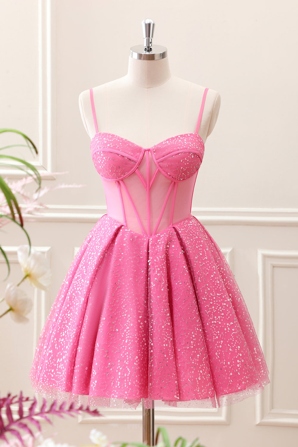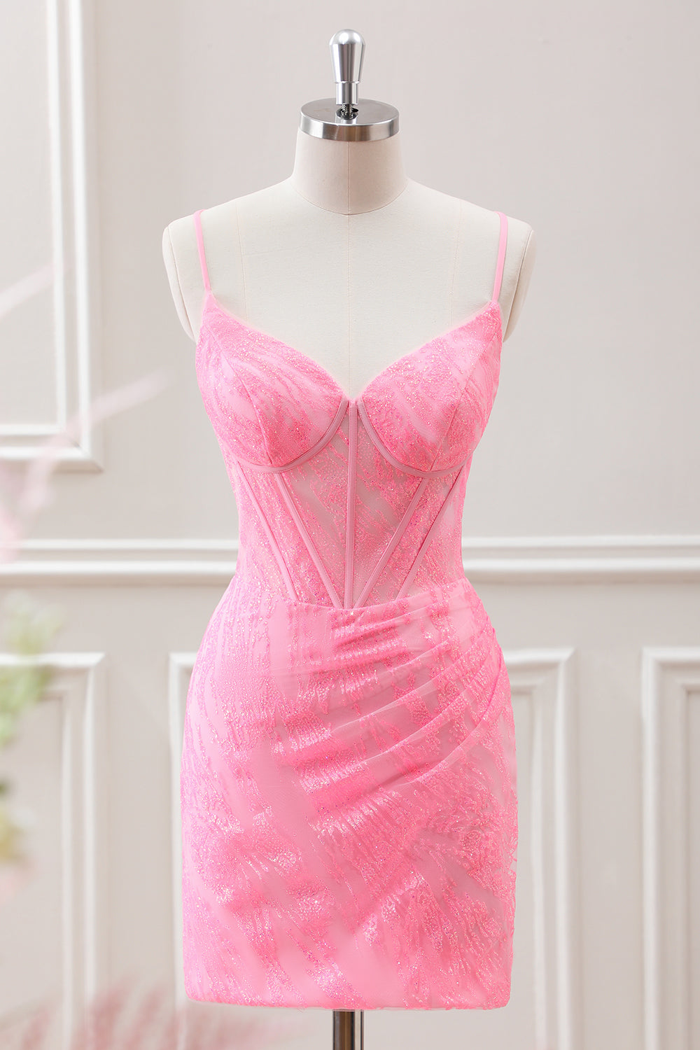 Pink A-Line Spaghetti Straps Corset Mini Dress with Sequins