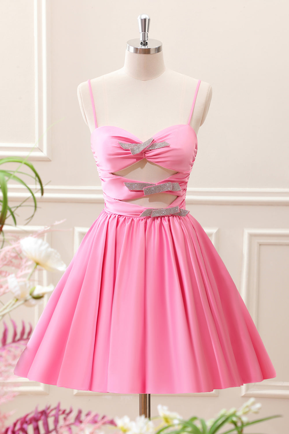 Preppy Pink A Line Spaghetti Straps Pleated Keyhole Mini Dress with Bows