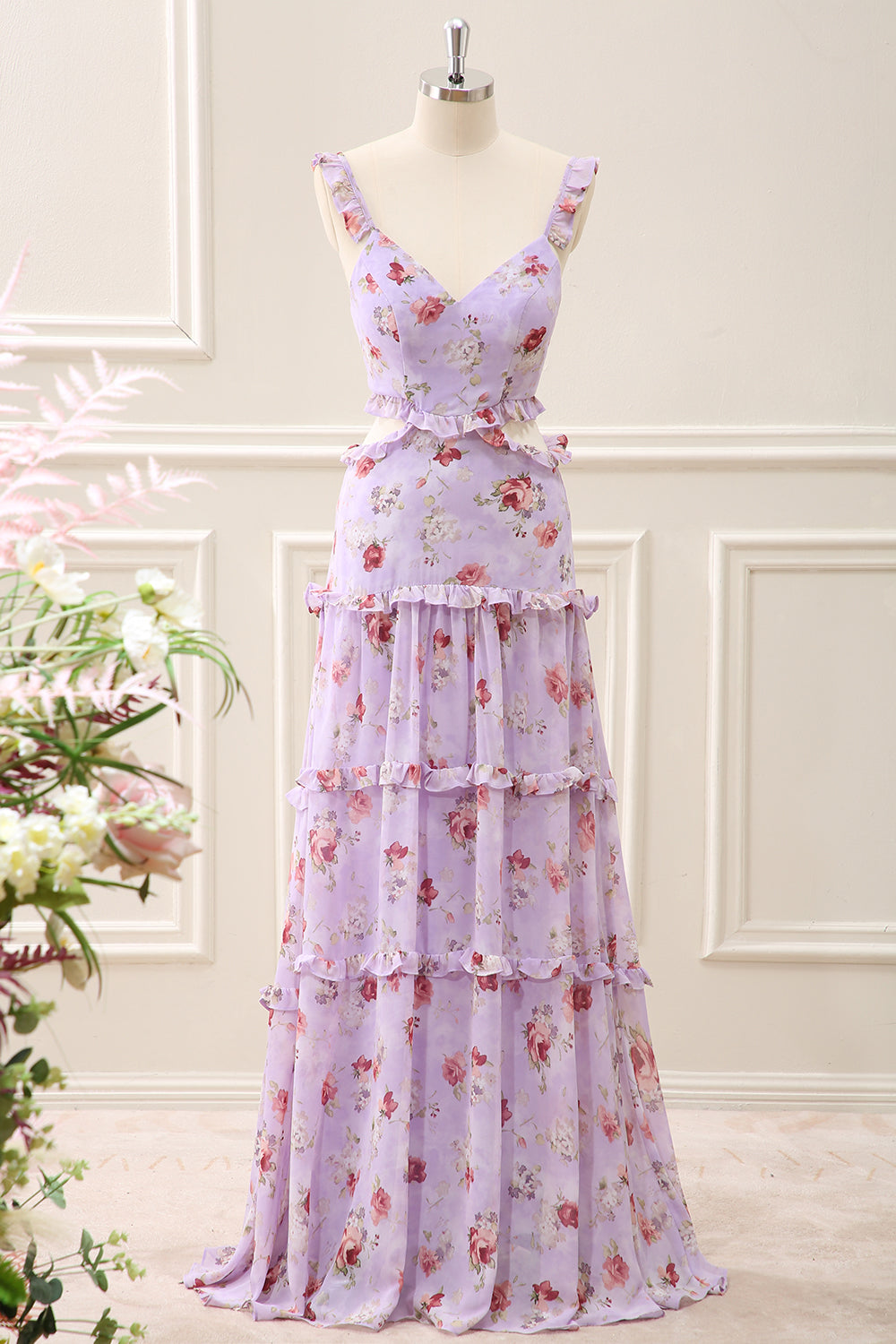 Grey Purple A Line Ruffled Cut Out Floral Maxi Dress