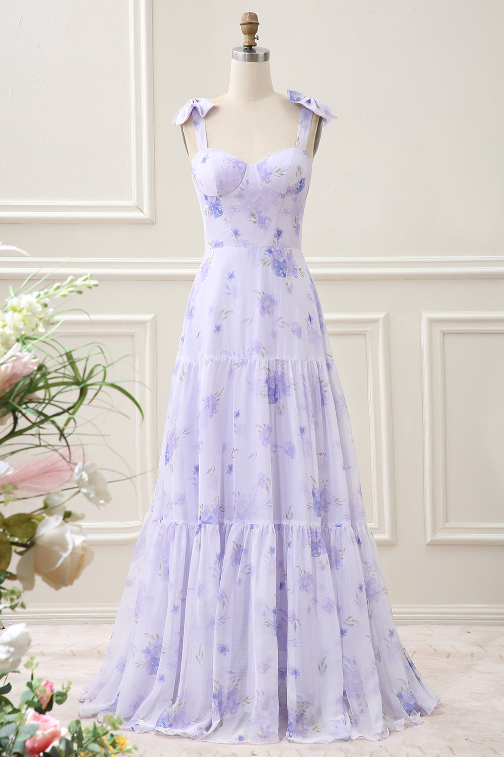 Lilac Corset Floral A Line Maxi Dress with Lace Up Back