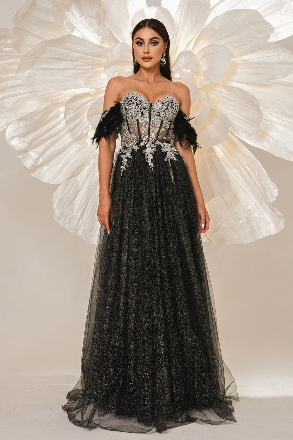 Glitter Black Corset Off The Shoulder A Line Maxi Dress with Appliques