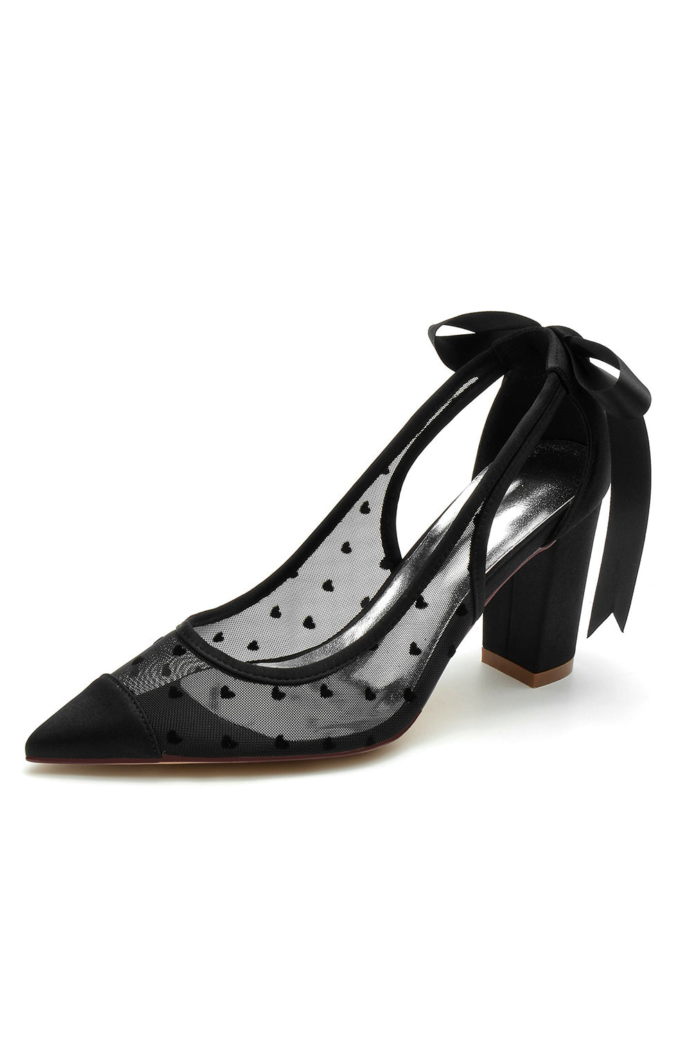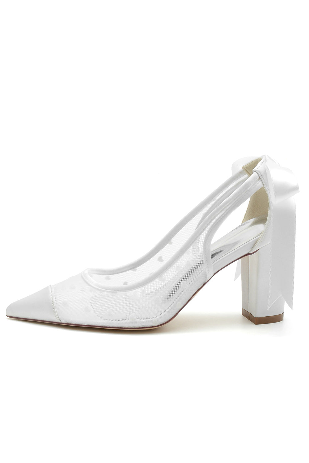 White Pointed Toe Block Heel Wedding Shoes With Bow